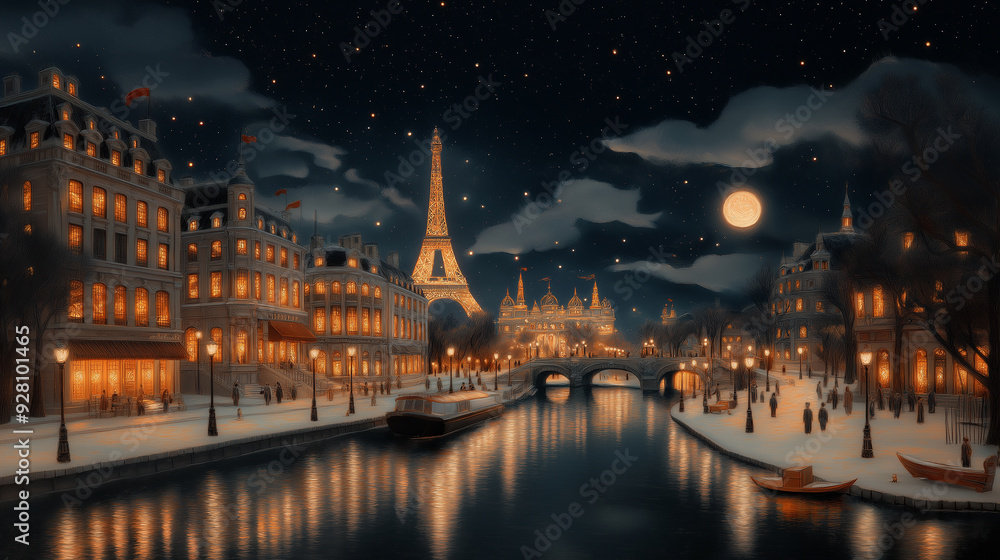 Paryż - Eiffel tower illuminating romantic night in paris with full moon #928101465