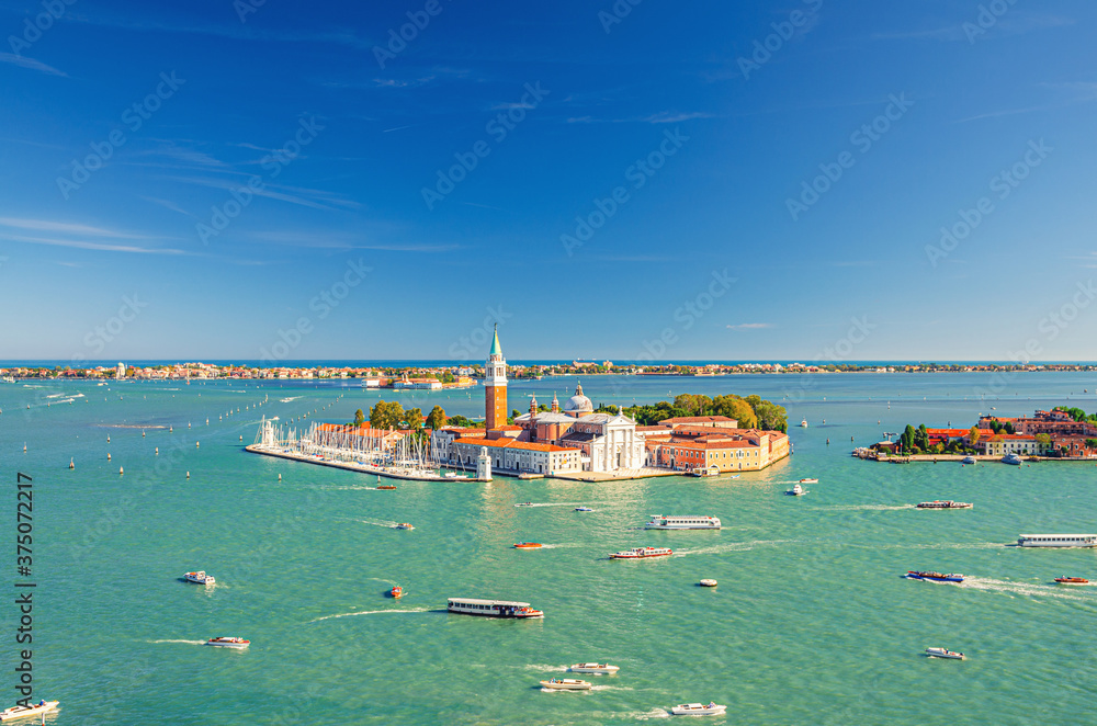 Wenecja - Aerial panoramic view of San Giorgio Maggiore island with Campanile San Giorgio in Venetian... #375072217
