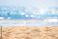 • Seascape abstract beach background. blur bokeh light of calm sea and sky. Focus on sand foreground.