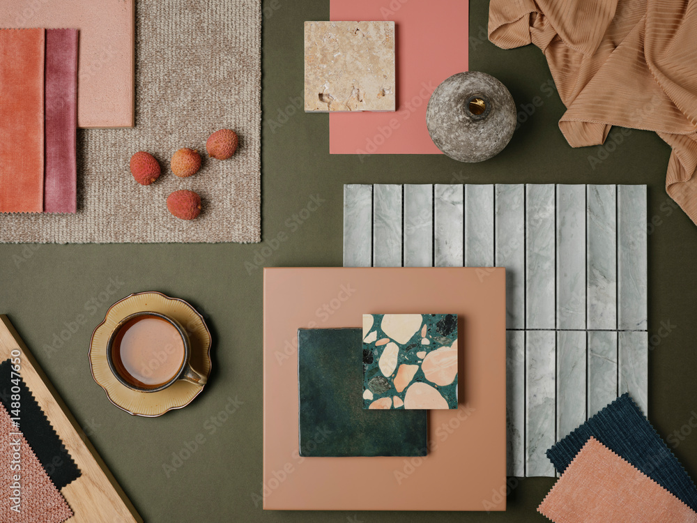 • A bold and colorful material arrangement featuring green and pink tones, natural stone, and rich fabric textures for a fresh and contemporary design.