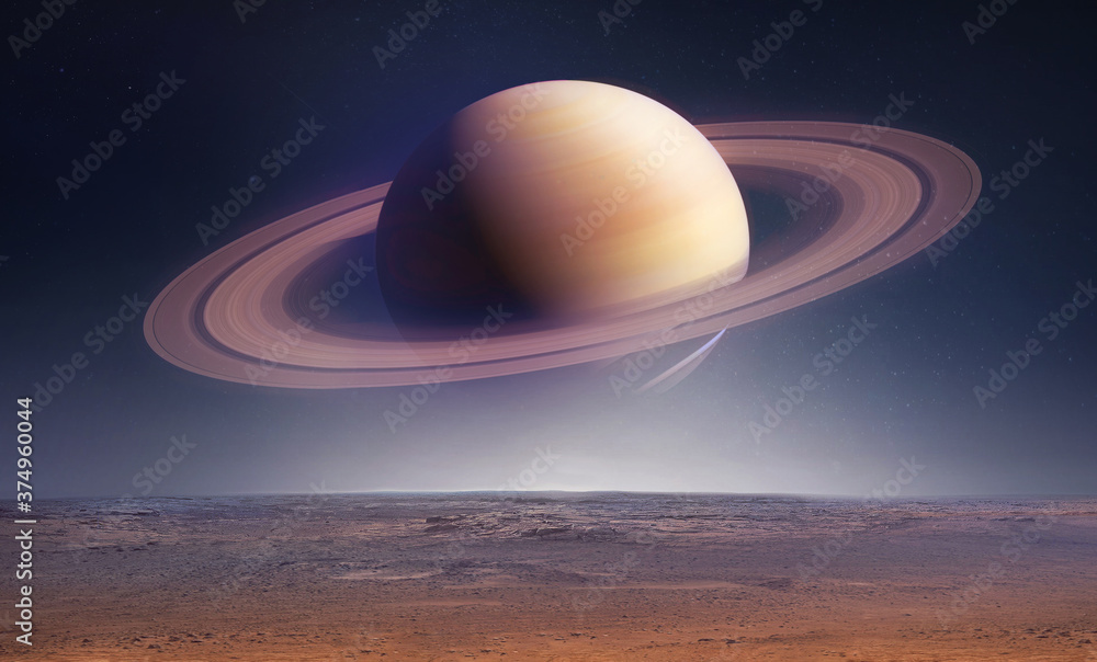 Planety - Landscape with saturn planet in sky with stars. Fantasy space wallpaper with planet over the... #374960044