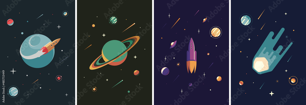Planety - Collection of space posters. Placard designs in flat style. #485753449