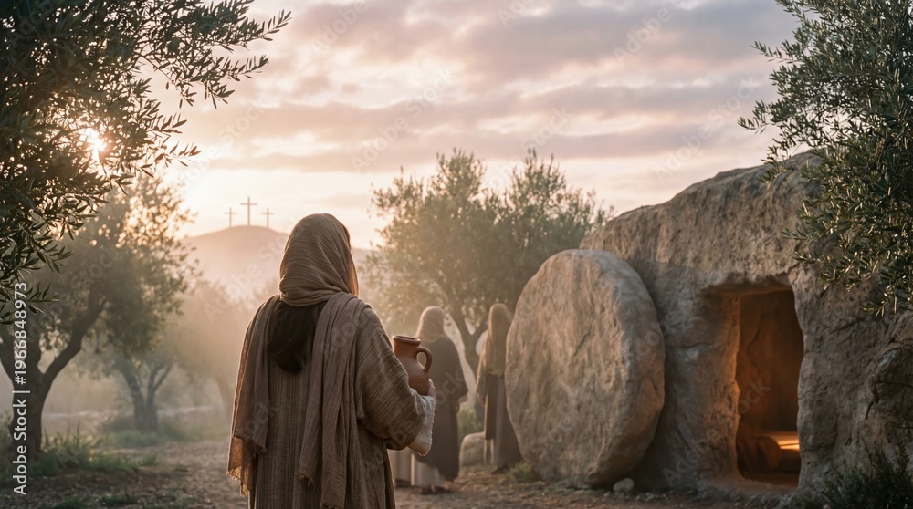 Przestrzeń - Woman standing near empty tomb of Christ on Resurrection morning. Biblical scene of Easter with... #1966848973