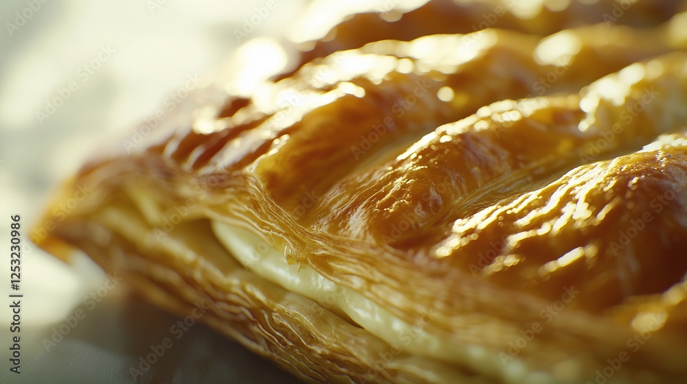 Makro - Makroaufnahme von goldbraun gebackenem Blätterteig. Detailreiche Nahaufnahme der knusprigen... #1253230986