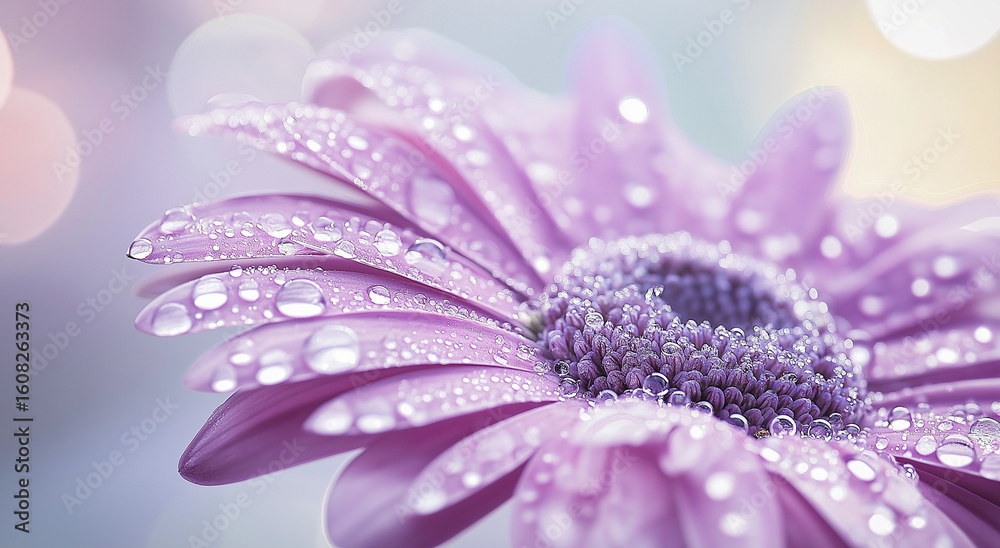 • Uma foto macro detalhada capturando a beleza natural de uma flor roxa com suas pétalas delicadamente adornadas com inúmeras gotas de água brilhantes, criando uma atmosfera serena.