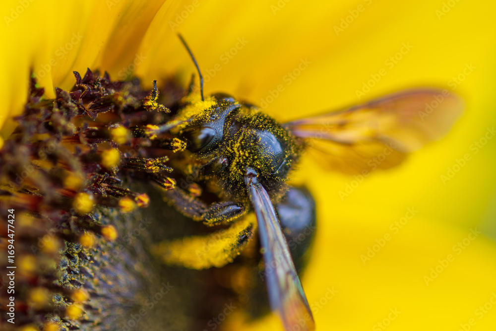 • 花粉まみれの蜂とひまわりのマクロ写真