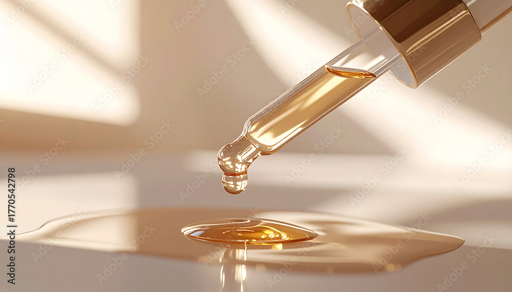 Makro - スキンケア用スポイトから美容液が滴る高品質なマクロ撮影。透明感のあるゴールデンカラーの美容オイルが光を反射し、美しい艶と質感を表現したミニマルな背景のビジュアル。/ High-quality... #1770542798