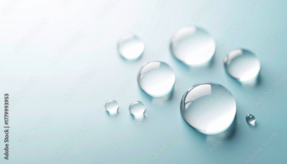 • 水滴 滴 水 丸い 球体 表面張力 透明 清潔感 清涼感 爽やか 光 反射 接写 マクロ 白背景 青 ブルー シンプル 潤い 瑞々しい