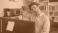 Retro - Man with hand behind neck at computer monitor in office workplace, seated at desk and leaning... #1765624435