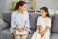 • Child and counselor in therapy session dialogue. Psychologist listens, offering guidance and support in clinic with clipboard for consultation. Concept caring, mental health and psychology support.