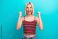 • Young woman with a joyful expression wearing a patterned tank top stands against a bright turquoise background