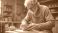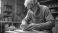 Retro - Old man works with clay on spinning wheel. Senior male potter makes pottery bowl in craft studio.... #1782637907
