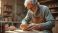 • Old man works with clay on spinning wheel. Senior male potter makes pottery bowl in craft studio. Enjoys art hobby, creating ceramic items. Workshop shelves show many handmade pots, jars, vessels