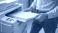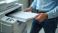 • Man places stack of paper into office printer tray for scanning. Person uses modern copying machine for document work. Business task with tech equipment done indoors.