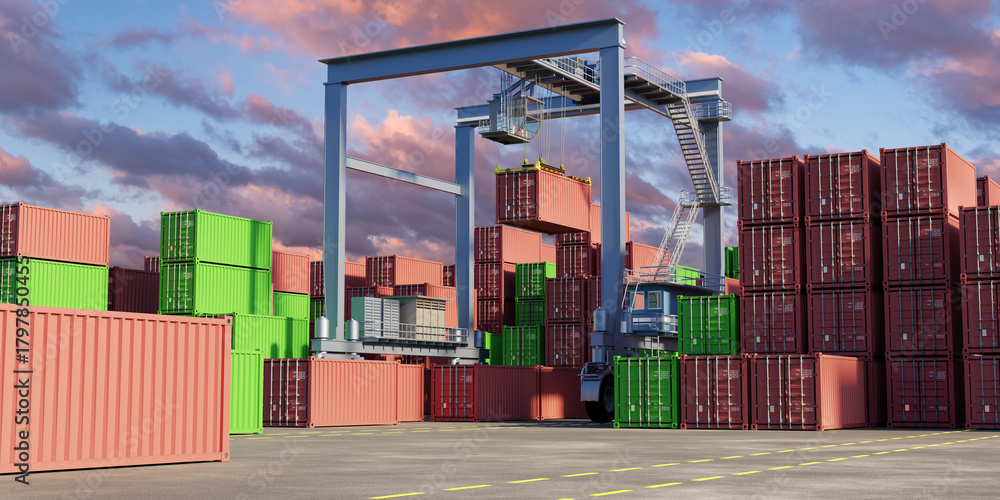 • Container crane lifting cargo containers in a busy shipping yard at sunset, representing logistics, transportation, export, import and global trade operations. 3d image.