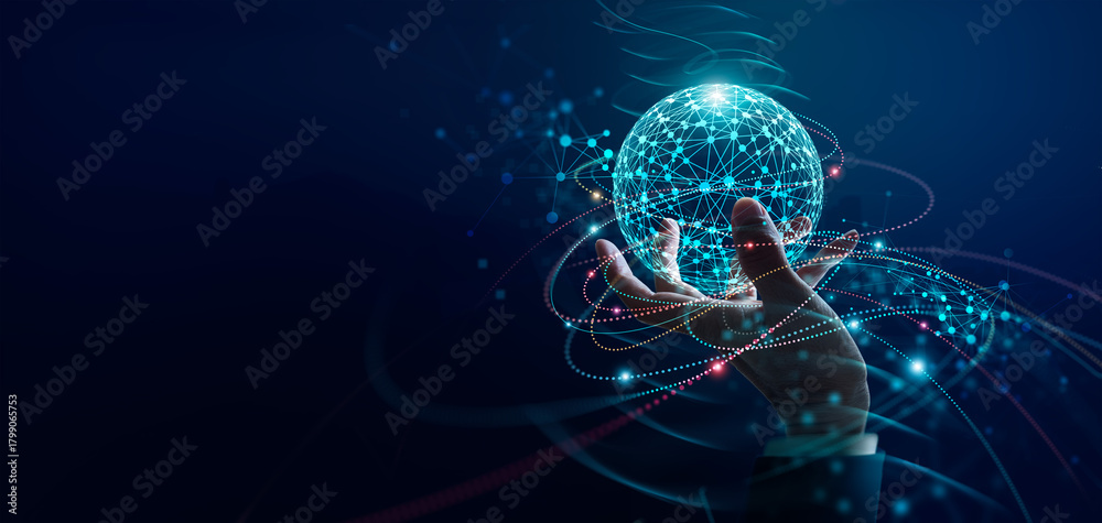 • Abstract, Big data network and AI technology, Deep learning and algorithm, Innovative and Data science, Businessman touch a data flow on global network and Fast connection. The world is in your hands.