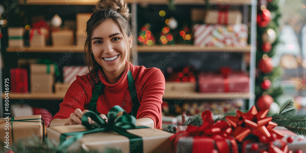 • Smiling female small business owner preparing Christmas gift packaging in a cozy decorated workspace