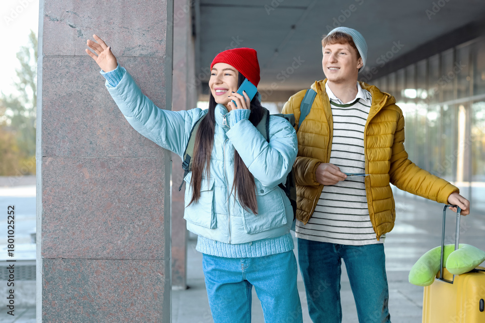 • Young couple with baggage talking by mobile phone near airport on autumn day