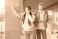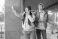 Retro - Young couple with baggage talking by mobile phone near airport on autumn day #1801025252