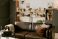 • Modern living room interior featuring empty brown leather sofa positioned in front of bookshelves filled with books, plants, and framed abstract art, psychology context implied