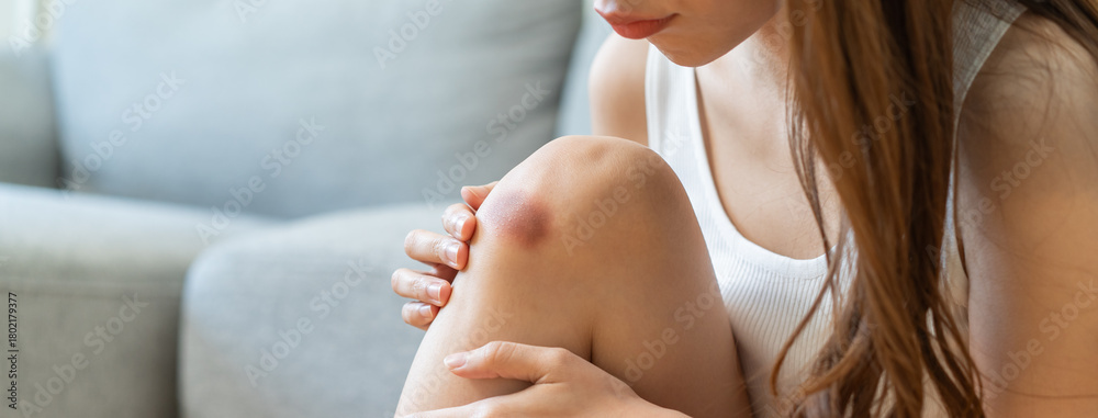 Retro - people get body injured concept, Close-up person got bruised on the knee. #1802179377