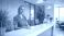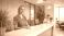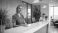 Retro - Smiling receptionist in uniform stands behind a modern reception desk in a clean office. She... #1810496341