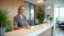 • Smiling receptionist in uniform stands behind a modern reception desk in a clean office. She looks friendly and welcoming to visitors or patients arriving.