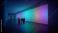 • People observing large colorful digital wall in dark futuristic room. Concept of AI enhanced environments, data visualization spaces, immersive tech art installations, and design systems.