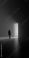 • Man standing near glowing portal doorway in dark futuristic minimal space. Concept of transition, opportunity, digital gateway, future environments and personal journey into unknown tech driven worlds