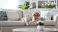 • Dog and cat sitting comfortably on sofa in stylish living room