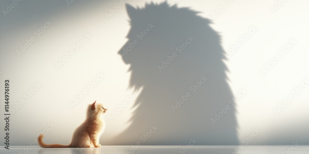 Koty - An orange kitten sits on a floor with the shadow of a lion projected behind it, symbolizing... #1144976193