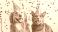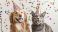 • Happy dog and cat together celebrating New Year's Eve wearing party hats with confetti falling. Website header with room