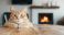 • Ginger cat relaxing on a table by the fireplace in a cozy home
