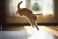 • A playful cat leaps mid-air in a sunlit room, capturing a moment of pure joy, boundless energy, and carefree exploration.