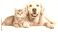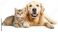 • A golden retriever and a tabby cat sit together, exuding warmth and companionship against a white background.