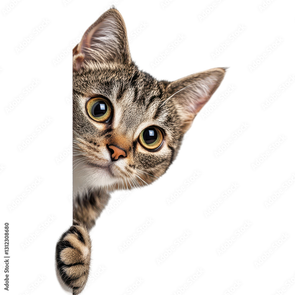 • Curious cat peeking around a corner with bright, expressive eyes. transparent background
