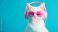 • A white cat wearing pink sunglasses and pink headphones is blowing bubbles