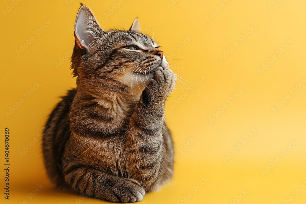 Koty - contemplative cat with paw near chin. A striped tabby cat sits pensively against a yellow... #1404570069
