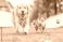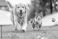 Koty - A playful golden retriever running towards a tabby cat, both with expressions of joy. The dog has... #1404808764