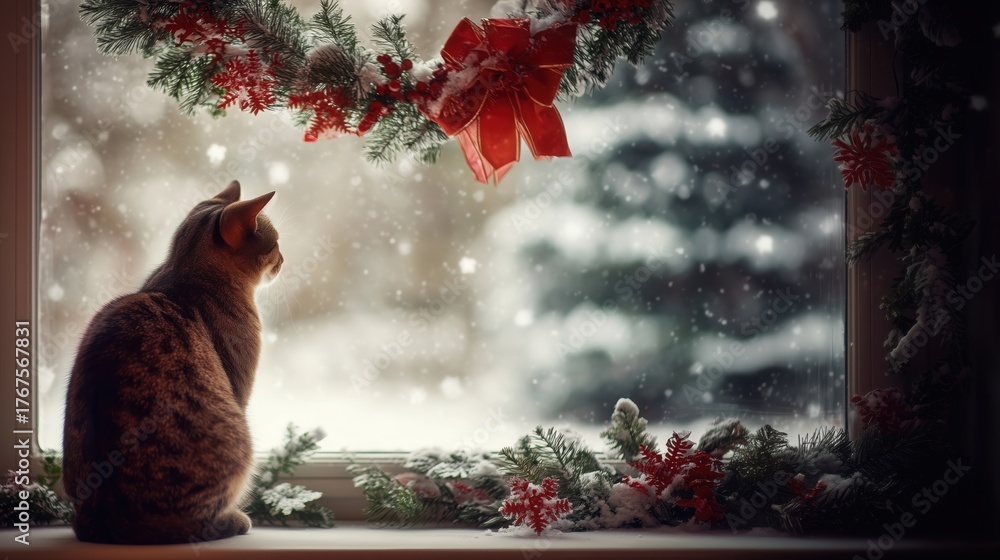 • Cozy Christmas scene with a cat looking out the window at the snow.