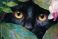 • Intriguing close-up of a black cat peering from behind lush foliage and blossoms, showcasing detailed textures and vibrant colors.