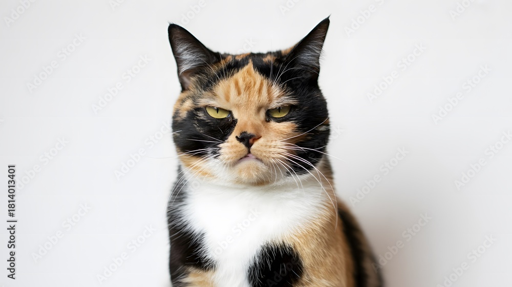 Koty - Grumpy calico cat with intense green eyes looking directly forward #1814013401