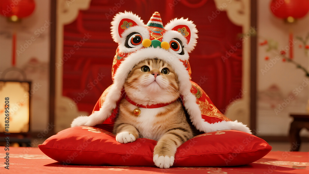 • Cute cat wearing chinese lion dance costume head, funny new year pet