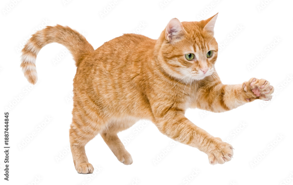 • playful orange tabby cat reaching out with a paw in a dynamic, active pose on a transparent background.