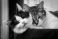 Koty - Two adult young cats black-white and tabby lie together in the green cat's bed #197060864