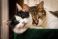 • Two adult young cats black-white and tabby lie together in the green cat's bed