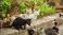 • Group of stray cats sitting on pathway curb, looking up as someone is about to throw them some food.