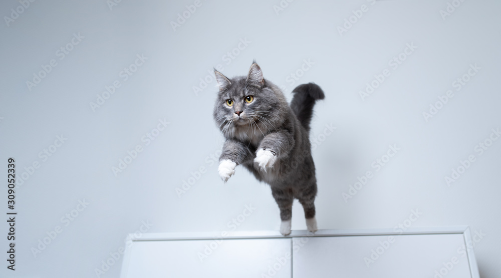 • young blue tabby maine coon cat with white paws jumping off a white cupboard indoors with copy space