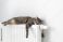 Koty - The cat lies on a heating radiator against the background of a gray wall. The cat warms up on the... #421745515