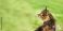 • A beautiful stray cat sits in the green grass and looks to the side. banner, copy space